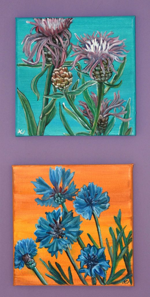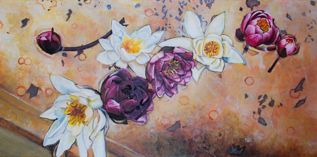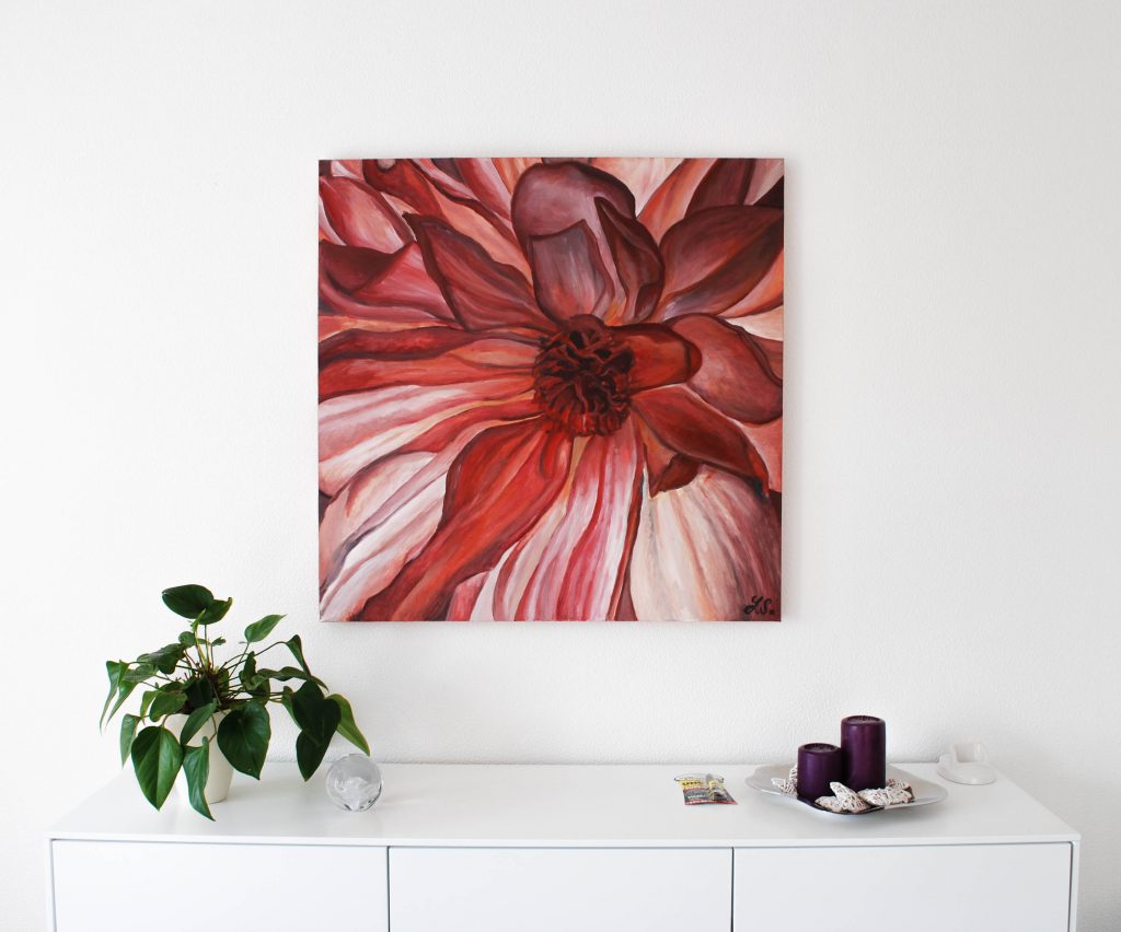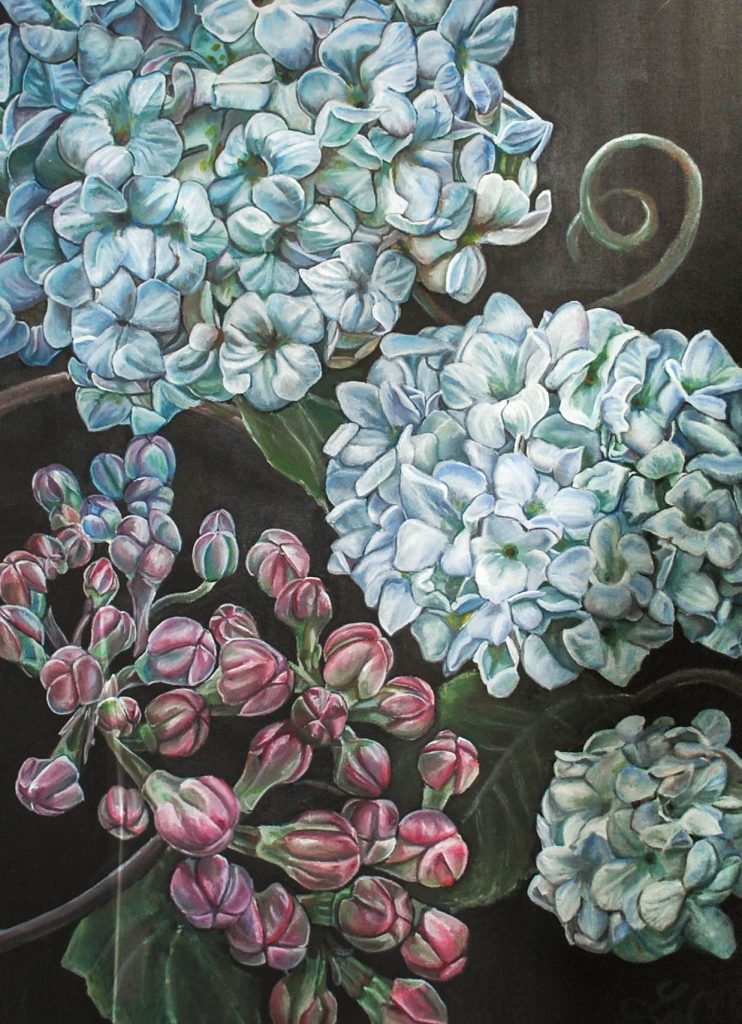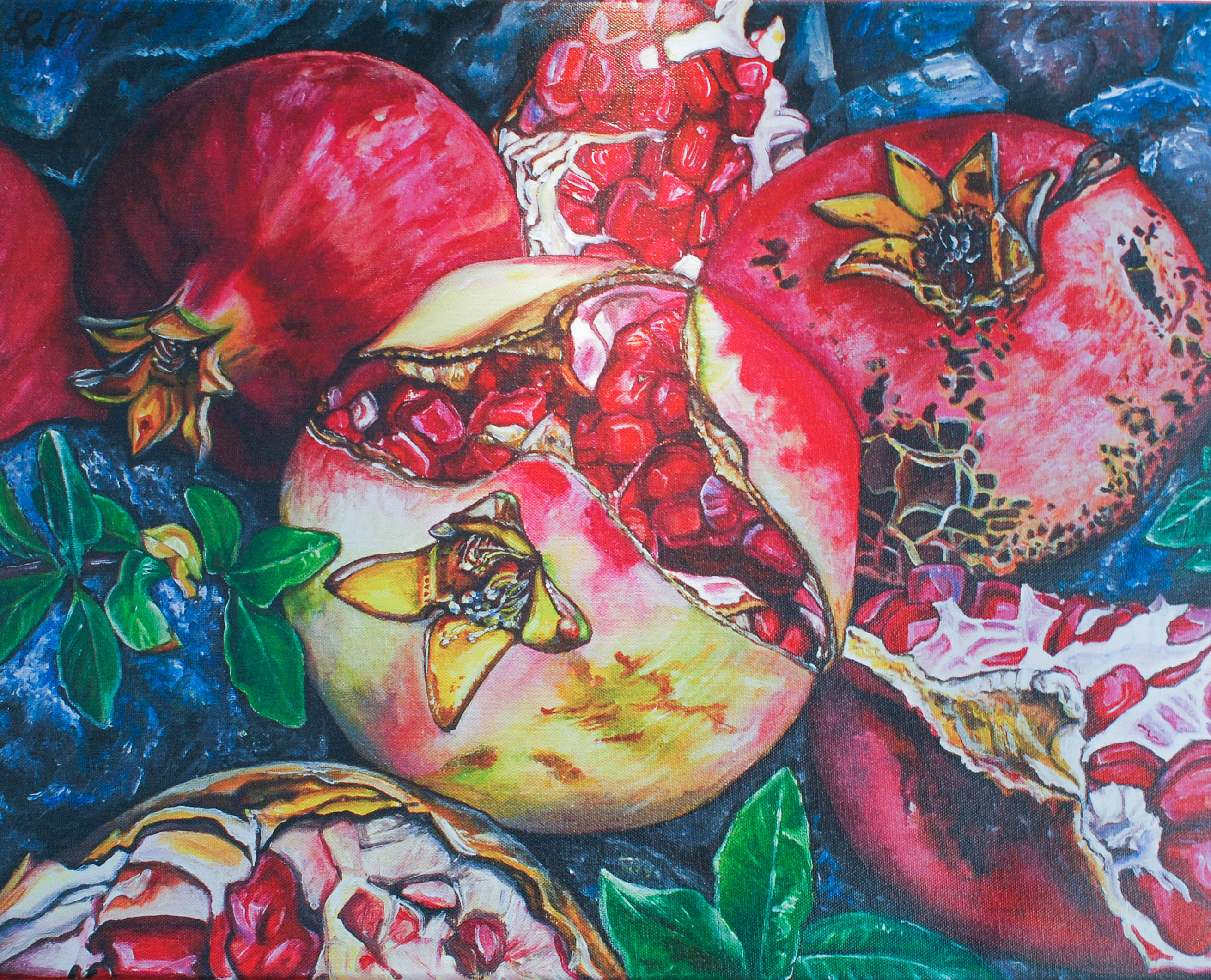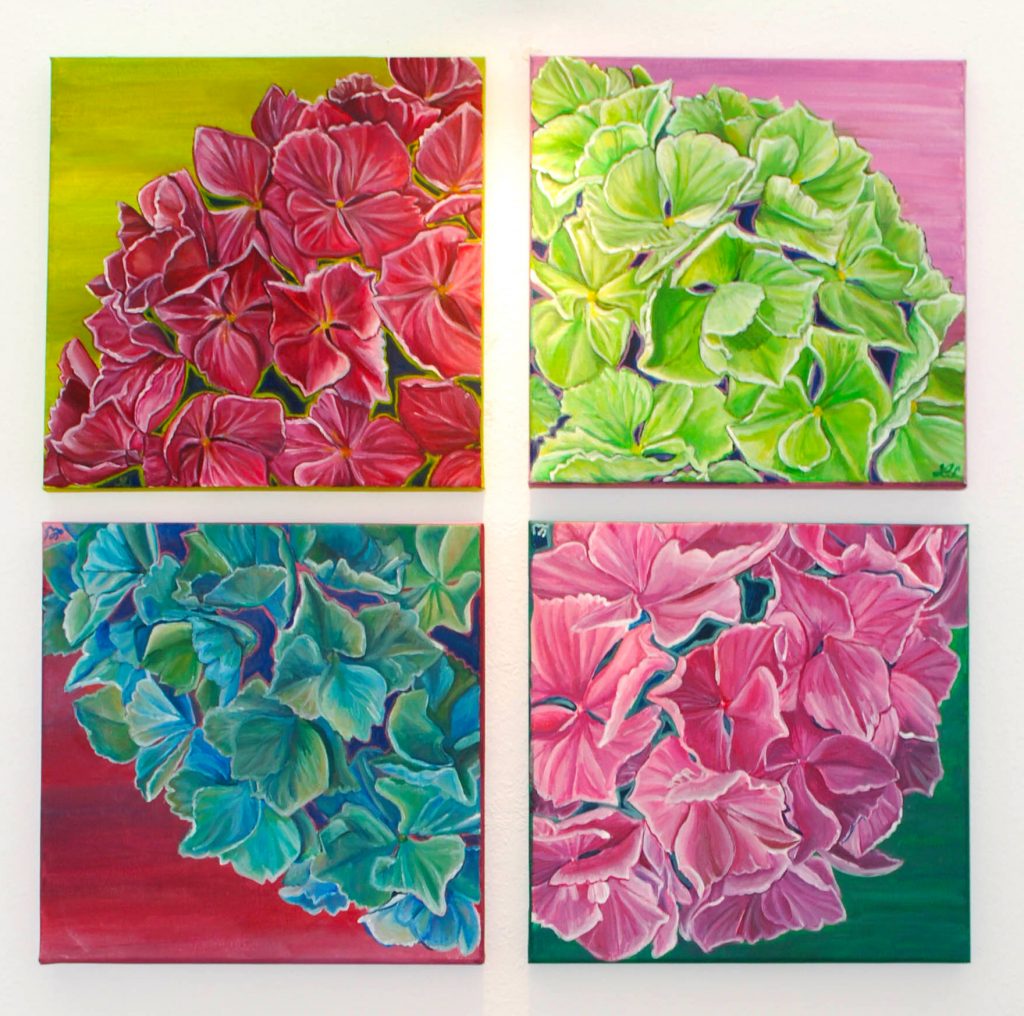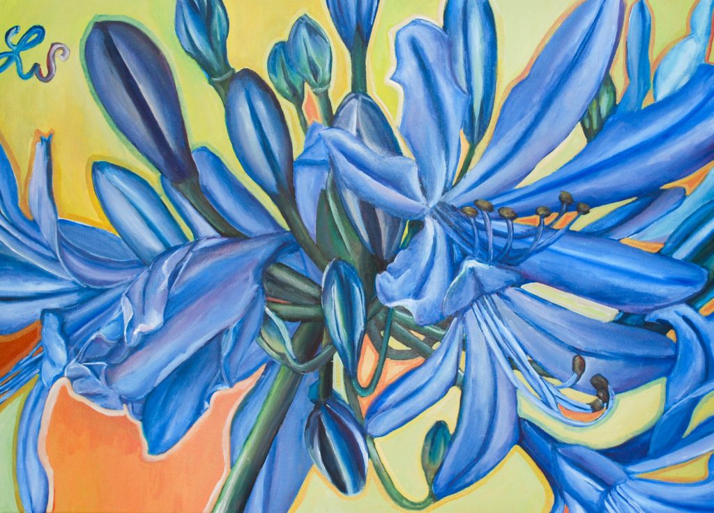 Kunst & Commissions 'Frida's not dead' - Akryl auf Leinwand. 'Granatäpfel', Akrly auf Leinwand. 'Gelbe Iris', Akryl auf Leinwand Schneeballstrauch - makro; Akryl auf Leinwand 'Blüte in Rosé', Akryl auf Leinwand 'Seerosen', Akryl auf Leinwand. 'Blaue Blume', Akryl auf Leinwand. Miniserie 'Wildblumen' 20x20cm, Akryl auf Leinwand 'Hortensien Mosaik', je 30x30cm, Akryl auf Leinwand Schulprojekt 2008 'Ich bin im Bilde' - Selbstportrait (-->s. Morgengruß v. Carl Ludwig Becker) Adaption von Tamara de Lempickas 'Les jeunes filles' mit meiner Schwester und mir 'The clam before the storm', Akryl auf Leinwand.