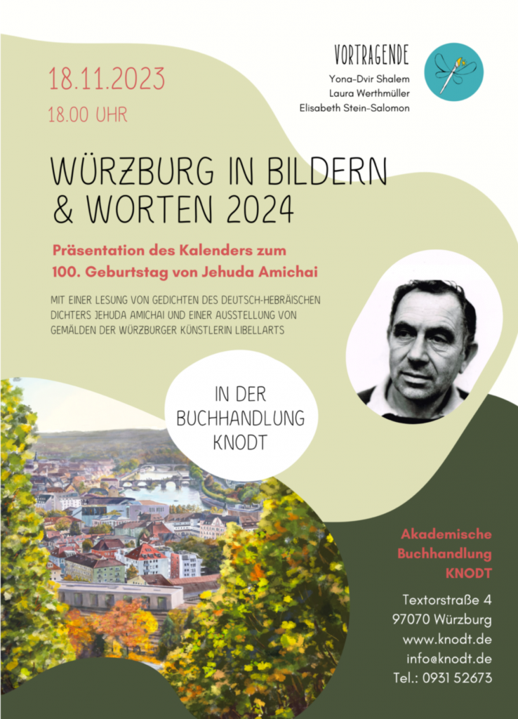Ganz neu gibt es jetzt aber einen Würzburg-Kalender von mir und meinem Freund, Dichter und Übersetzter Yona-Dvir Shalem. Darin findet ihr nicht nur farbenfrohe Landschaftsmalerei von mir, sondern auch sehr schöne Gedichte von Jehudua Amichai, einem hebräischen Dichter, der 1924 in Würzburg geboren wurde und zur Zeit des Nationalsozialismus nach Israel/Palästina flüchten musste. Amichai hätte im Jahr 2024 seinen 100. Geburtstag gefeiert. Zu diesem Anlass hat Dvir Amichais Gedichte, die sowohl auf einer konkreten als auch auf einer metaphorischen Ebene Bezüge zu Würzburg aufweisen, aus dem Hebräischen übersetzt. Und tatsächlich passen sie wunderbar zu meinen Würzburg-Gemälden.
